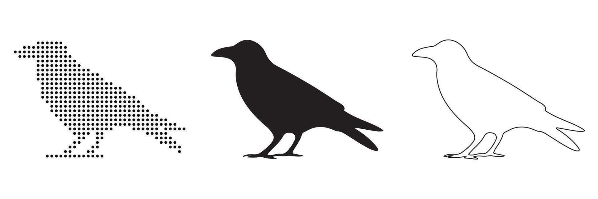 Three distinct visual styles of a crow or raven dot matrix, silhouette, and outline Pro Vector