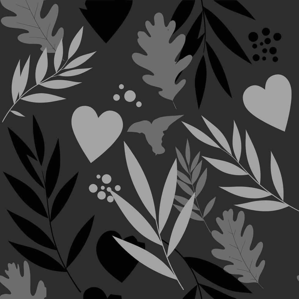 Seamless monochromatic botanical pattern with hearts, leaves, and abstract shapes. vector