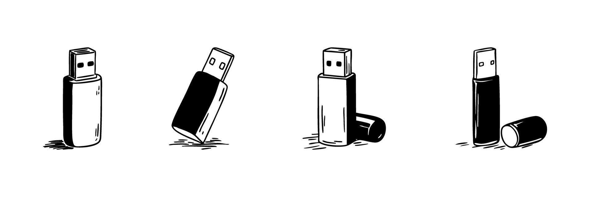 Usb Flash Drive Doodle Sketch Set. Portable Data Storage And File Transfer Devices In Hand Drawn Style Collection. Digital Information Management. Hand Drawn Isolated Illustration Pro Vector