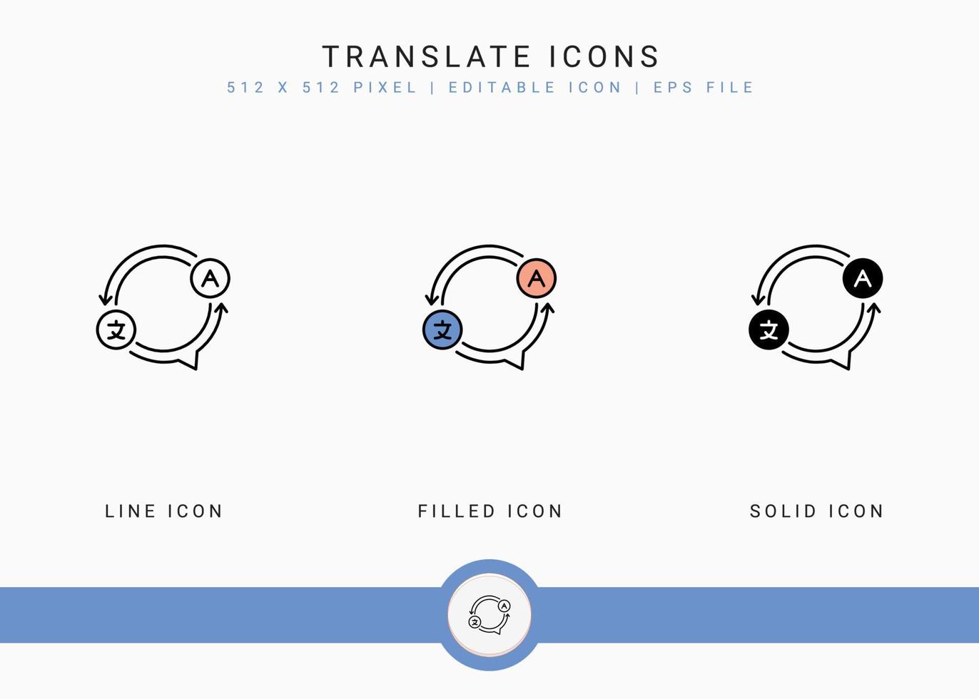 Translate icons set vector illustration with solid icon line style. Text language publication concept. Editable stroke icon on isolated background for web design, user interface, and mobile app Pro Vector and Pro SVG