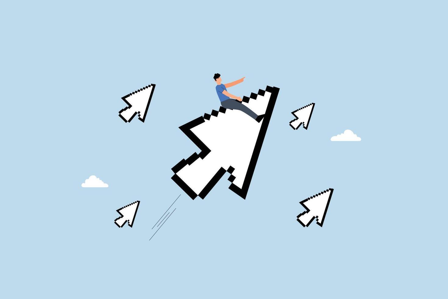 digital marketing, businessman riding digital pixel mouse pointer to click on button Pro Vector