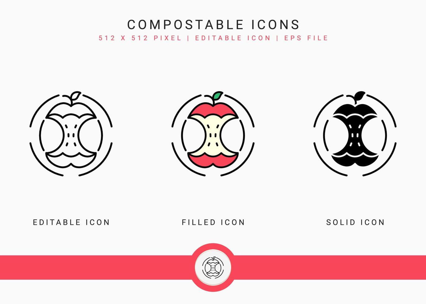 Compostable icons set vector illustration with solid icon line style. Bio decompose concept. Editable stroke icon on isolated background for web design, infographic and UI mobile app. Pro Vector and Pro SVG