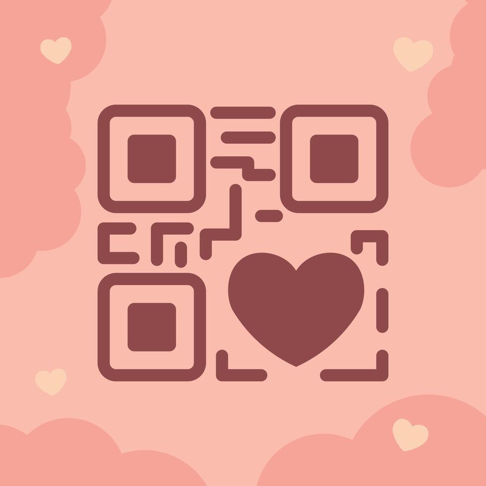 Valentine qr code heart illustration. Centered qr style block form. Solid heart corner accent. Soft abstract background shapes. Warm minimal romantic tone. Pro Vector