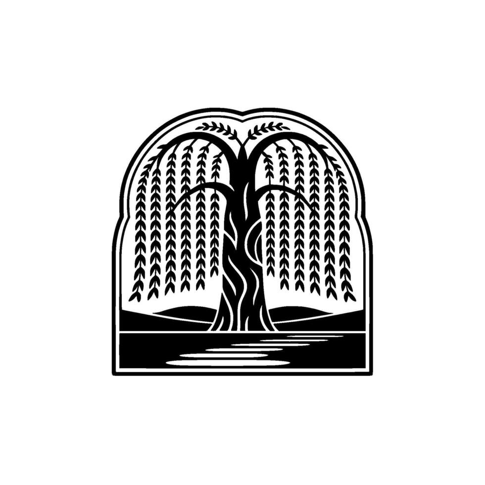 A classic stylized silhouette of a weeping willow tree with flowing branches standing beside a serene reflective water body within an arched frame Pro Vector
