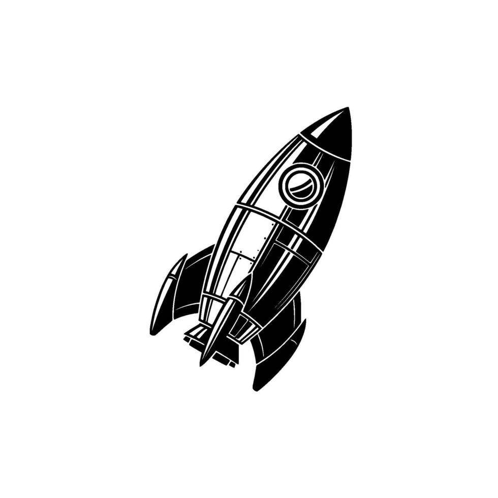 Stylized retro rocket ship in ink silhouette ascending with streamlined fins and circular window Pro Vector