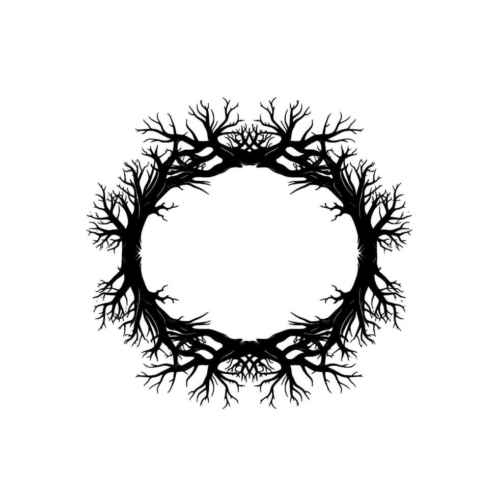 A striking circular frame composed of intertwined bare tree branches and roots in a stark silhouette Pro Vector