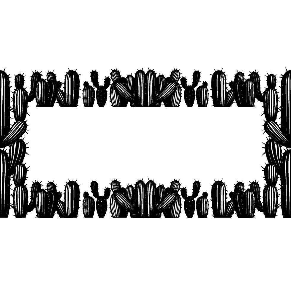 Monochrome illustration of a decorative border composed of various stylized saguaro and smaller cacti with sharp spines Pro Vector