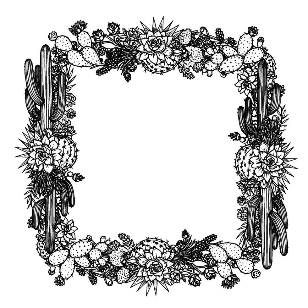 Intricate hand drawn illustration of a decorative square frame composed of various desert succulents and cacti creating a wild botanical border Pro Vector