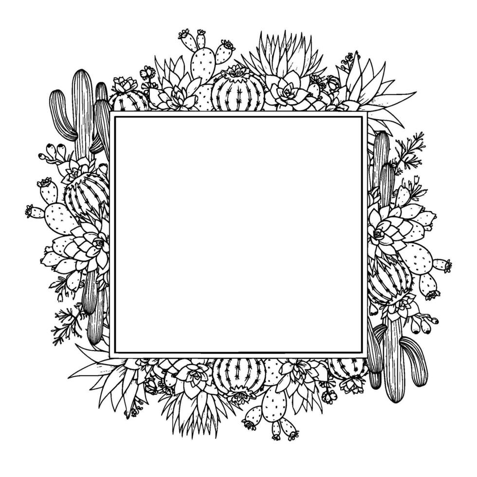 A hand drawn illustration of a square frame bordered by a dense arrangement of various desert succulents and cacti plants Pro Vector