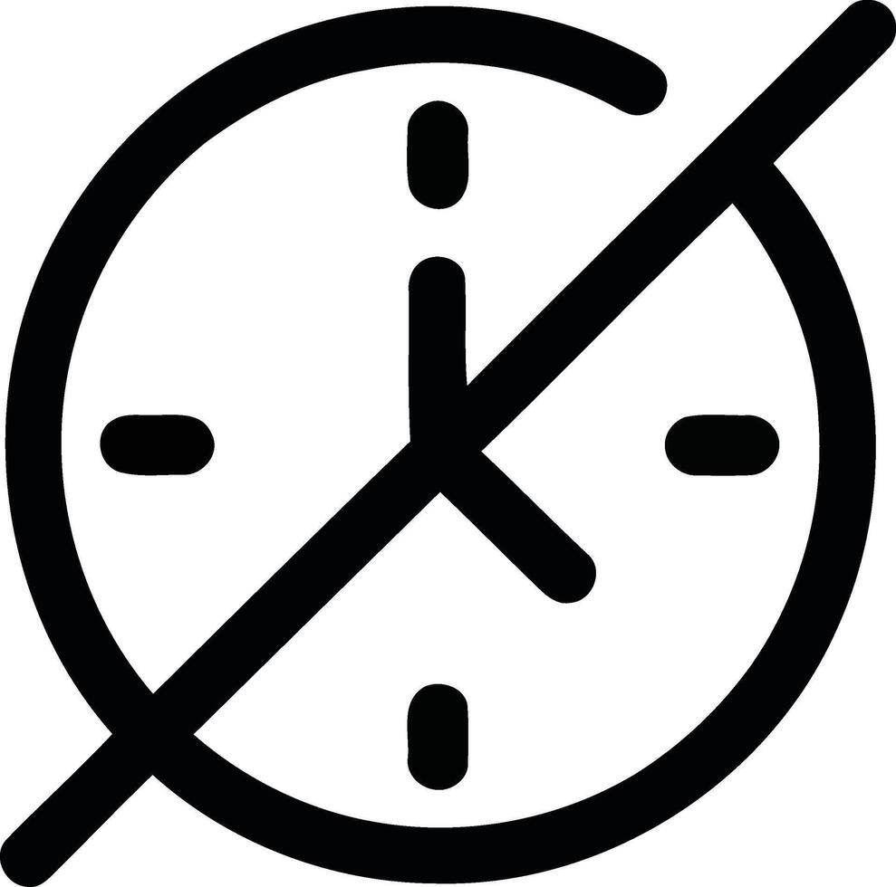 A minimalist black and white icon depicting a clock with a strikethrough line symbolizing no time or time limit Pro Vector