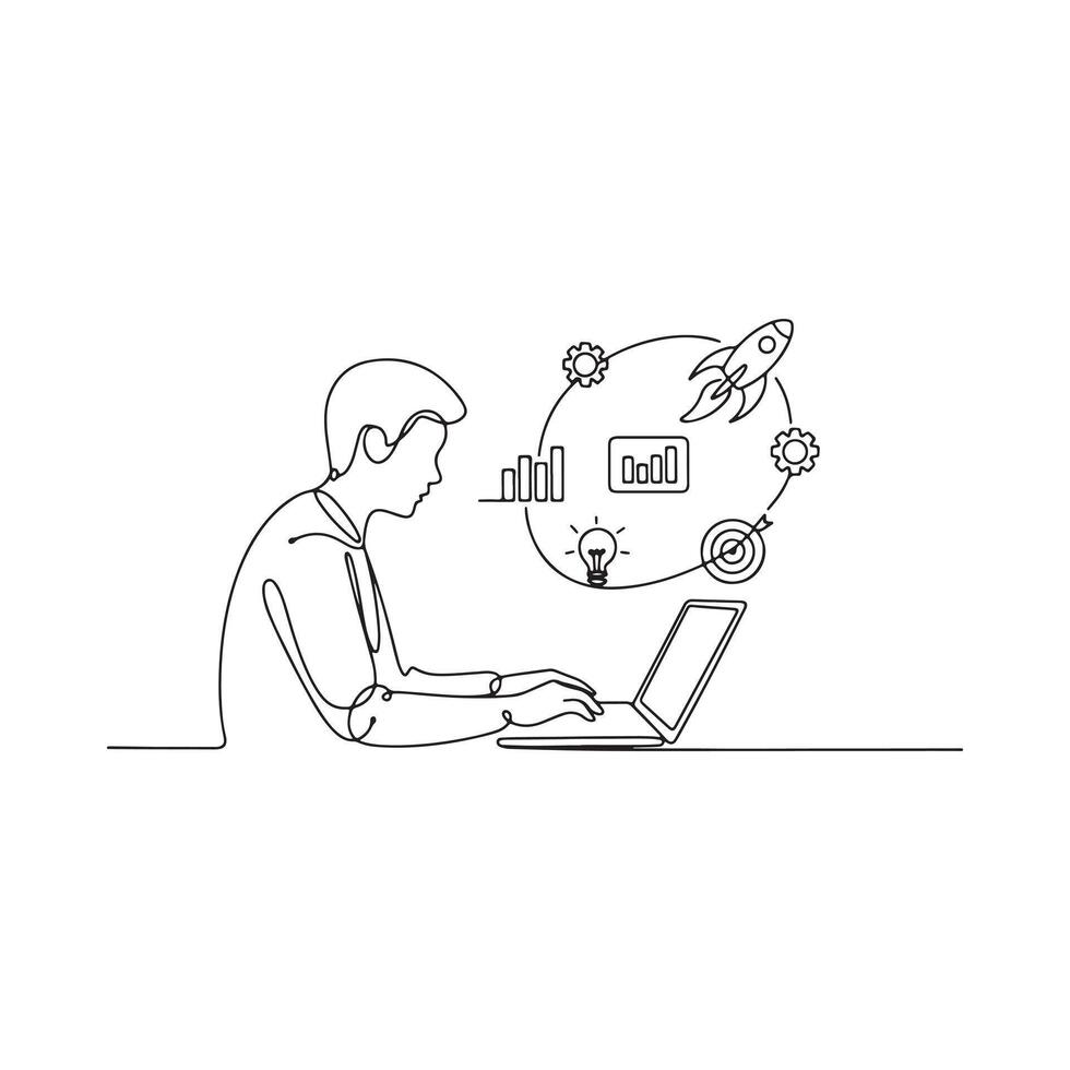 Continuous line drawing of a person working on a startup idea and business strategy on a laptop Pro Vector
