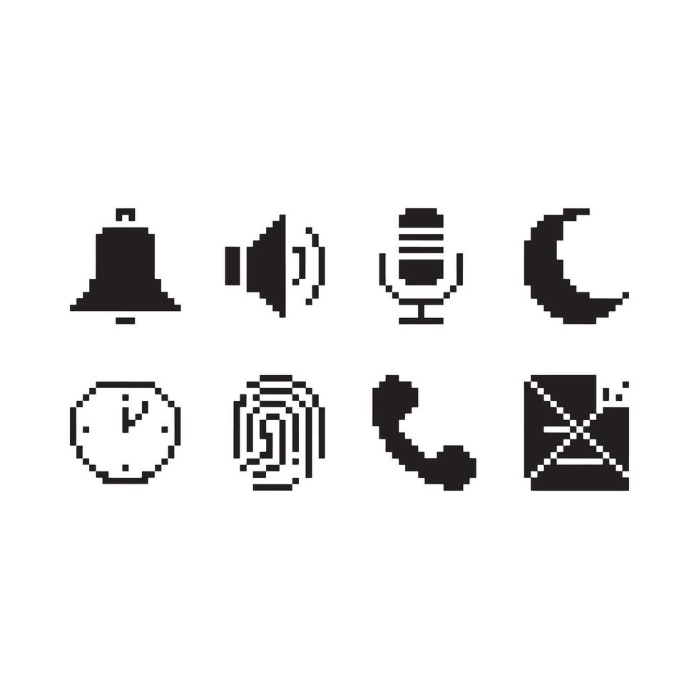 A collection of retro pixel art icons representing common smartphone functions Pro Vector