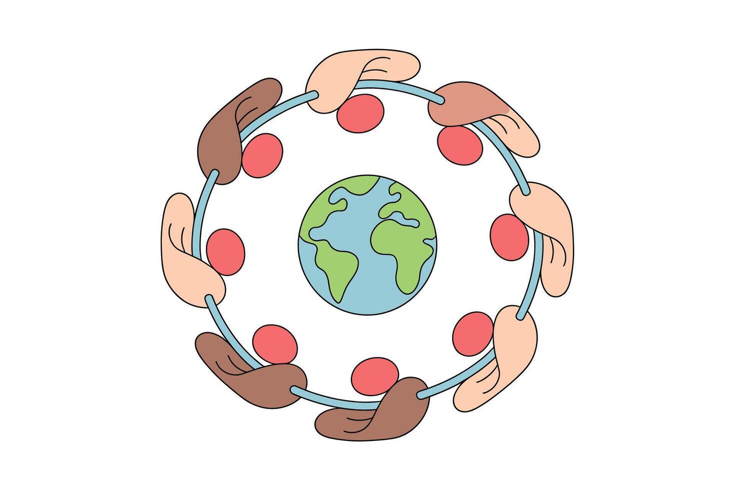 Diverse hands joining together around the Earth for unity and global connection Pro Vector