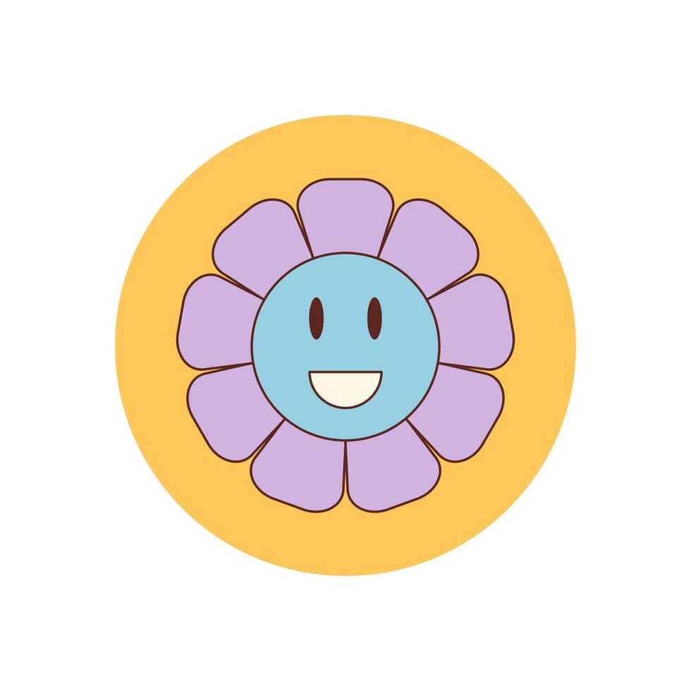 Groovy y2k flower sticker with daisy face in cartoon graphic style. Yellow badge with retro smile makes a playful seal for package, fun graphic for positive label or creative groovy element. Pro Vector
