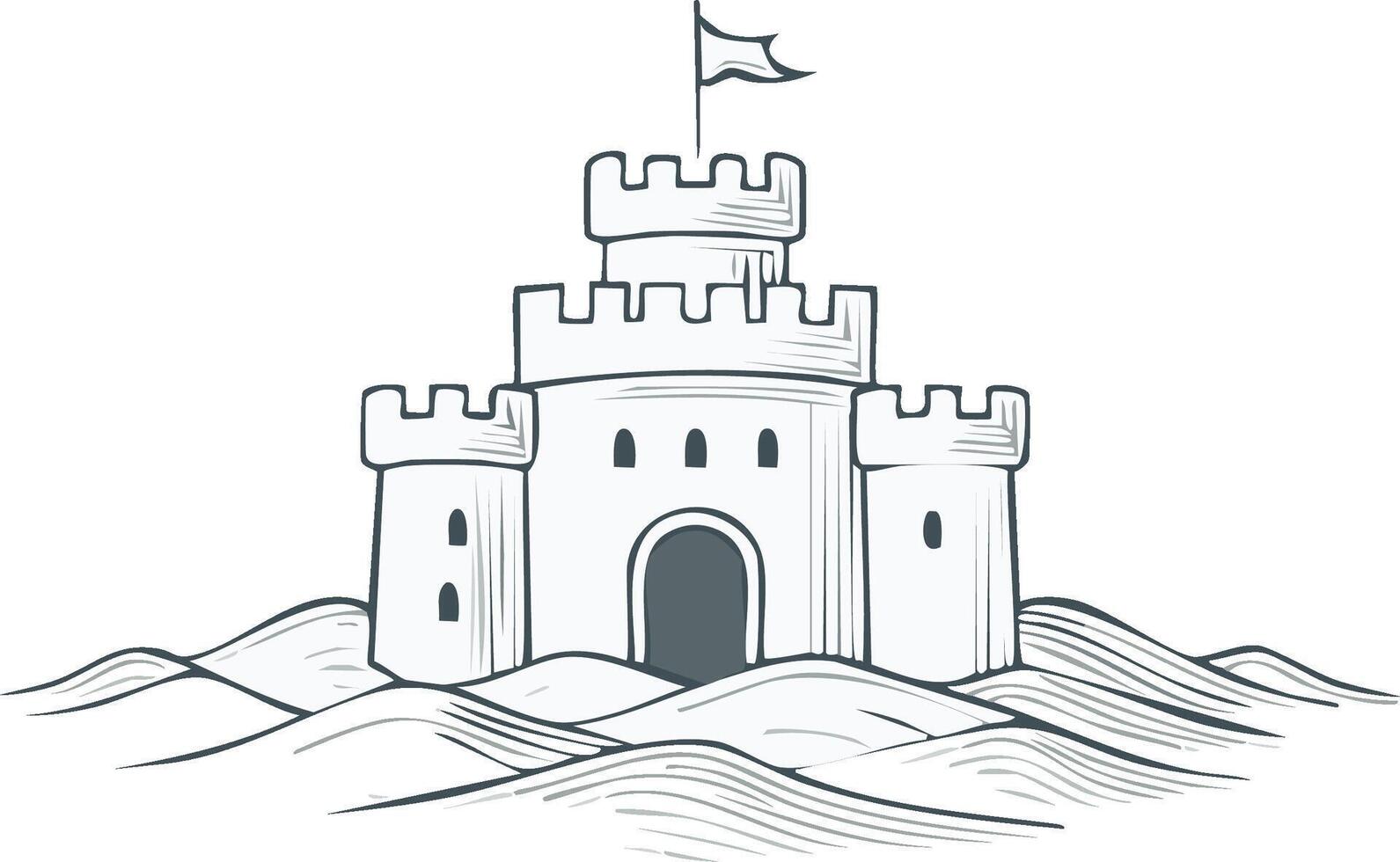 Simple sandcastle with a waving flag sketched with hatch lines showing castle details on the beach Pro Vector