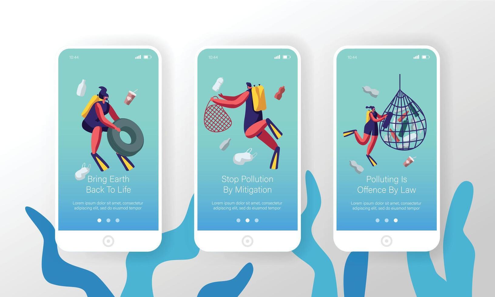 Plastic Pollution of Sea with Different Kinds of Garbage Mobile App Page Onboard Screen Set Scuba Divers Collect Trash into Basket Pro Vector