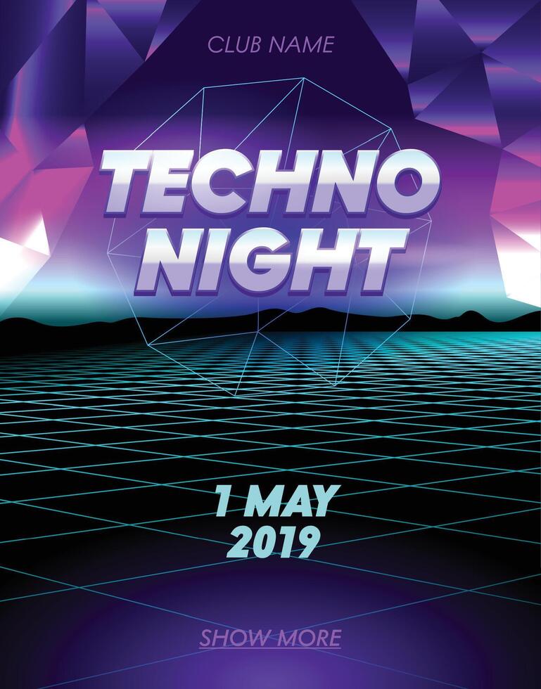Techno Night Banner with Typography, Club Party Poster on Synthwave Neon Grid Futuristic Background with Low Poly Triangulars Pro Vector