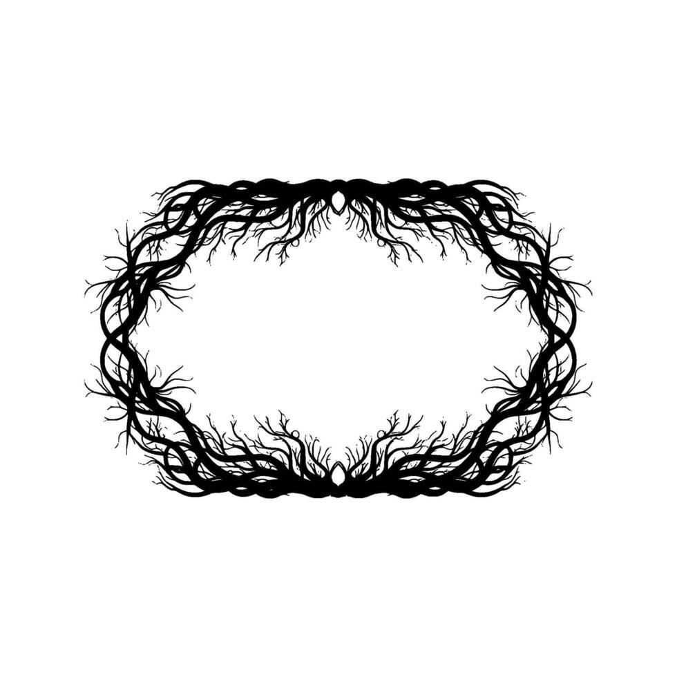 A symmetrical silhouette of a twisted and gnarled tree branch oval frame with intricate branching details Pro Vector