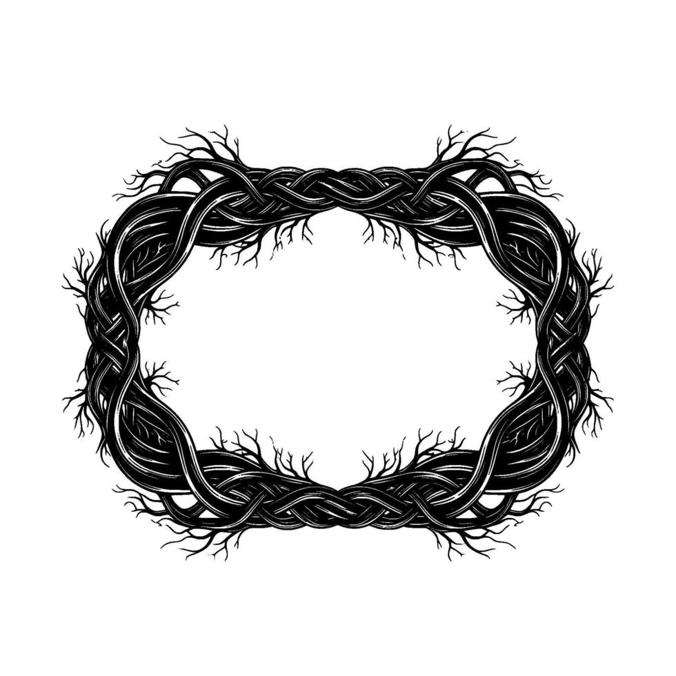 Intricate oval frame formed by interwoven gnarled tree roots with delicate branching patterns Pro Vector