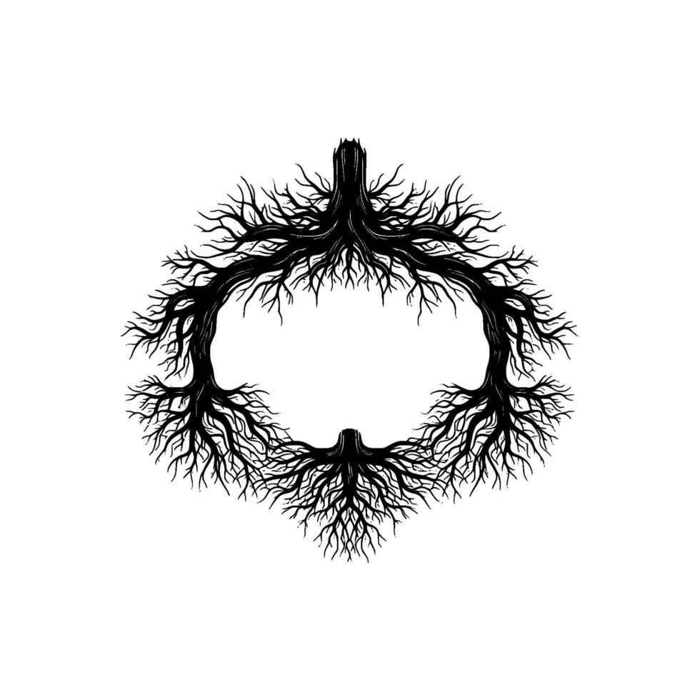 Intricate silhouette of interconnected tree roots forming a circular wreath Pro Vector