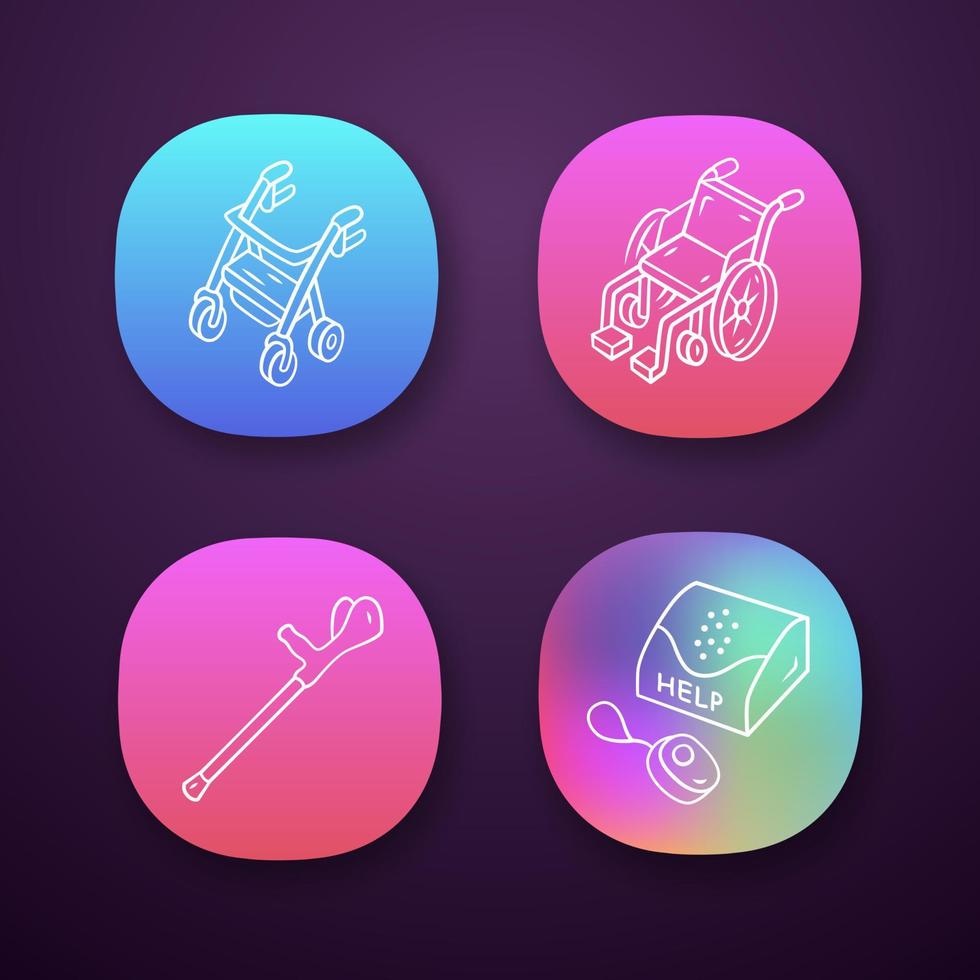 Disabled devices app icons set. Rollator, manual wheelchair, forearm crutch, personal emergency response system. UI UX user interface. Web or mobile applications. Vector isolated illustrations.. Pro Vector