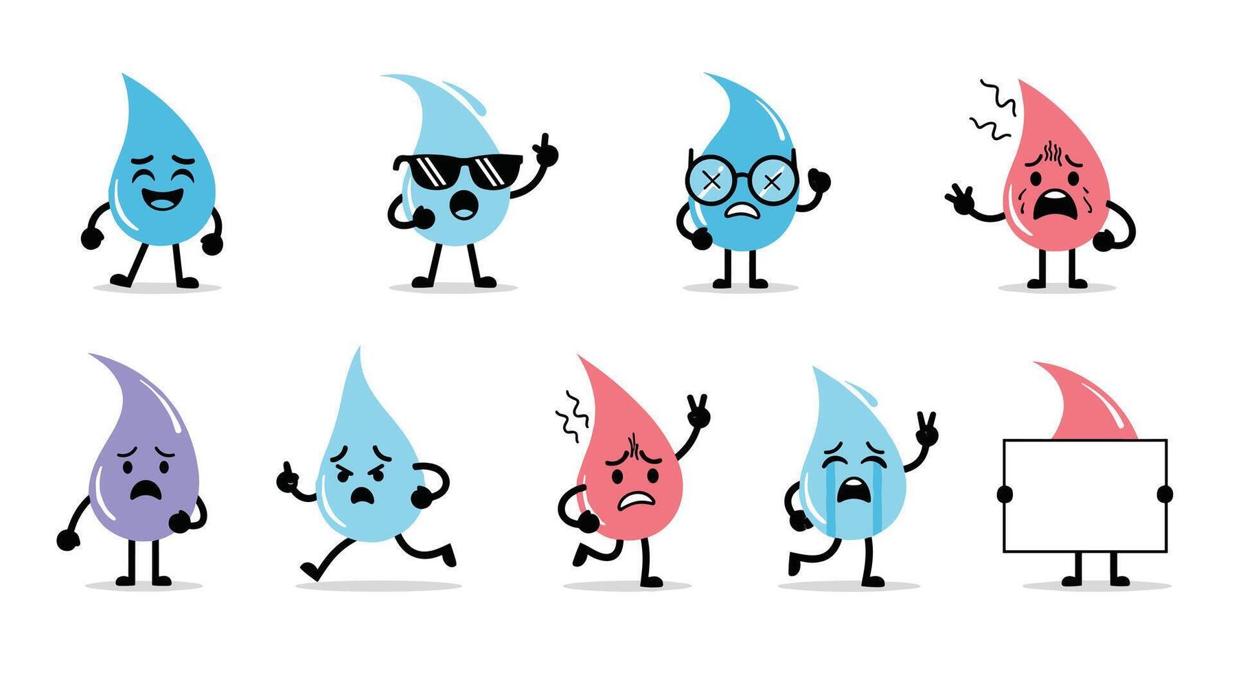 Diverse set of water drop cartoon characters displaying a range of emotions and actions, from happy to angry and crying. Pro Vector