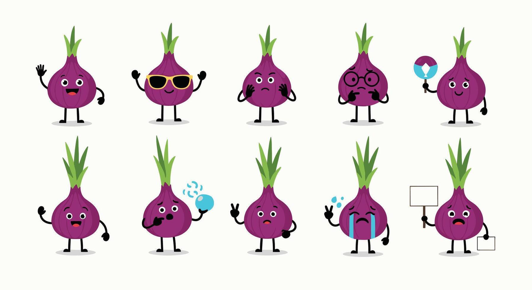 Diverse set of ten red onion cartoon characters displaying a range of emotions and actions, from happy to crying and cool. Pro Vector