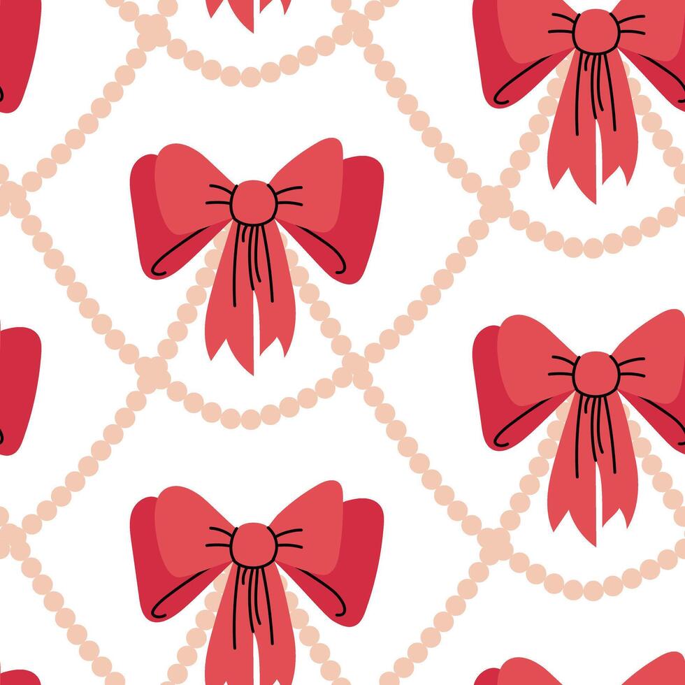 Seamless pattern with red double bows draped with pearl garlands. Flat style print, ideal for gift wrapping paper, festive fabric, or elegant digital background. Pro Vector