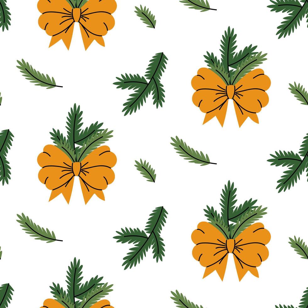 Seamless pattern with orange bows and scattered pine tree branches. Flat style print, ideal for holiday wrapping paper, festive fabric, or digital background design Pro Vector