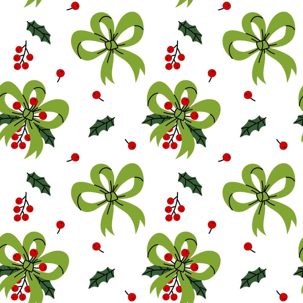 Seamless pattern with green bows in three loops with holly leaves and red rowan berries. A chaotic texture in a flat style, perfect for holiday wrapping paper, fabric, or digital technology. Pro Vector