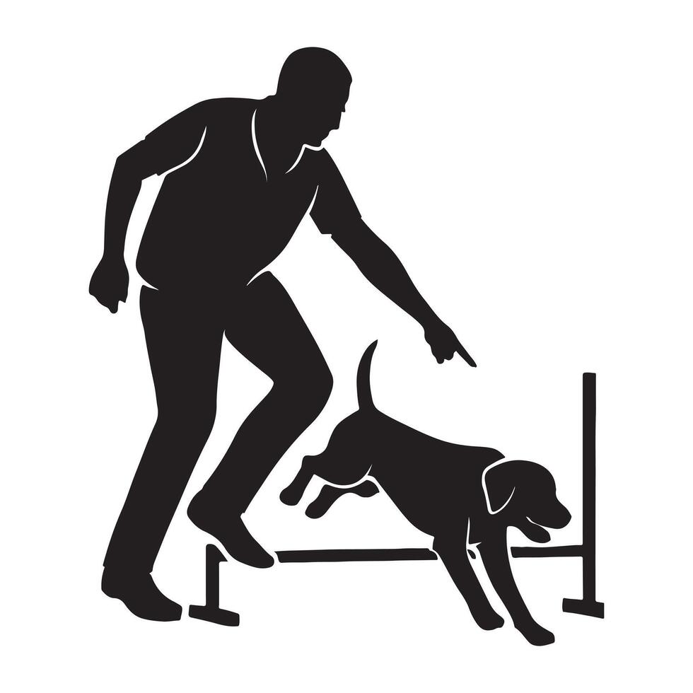 Man training a dog to jump over a hurdle, demonstrating obedience and agility exercises Pro Vector