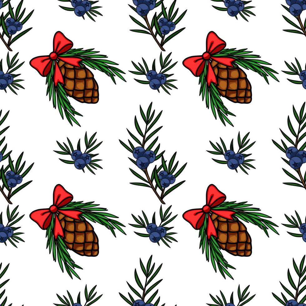 A delightful seamless pattern featuring pine cones adorned with red bows and sprigs of juniper berries, perfect for festive backgrounds. Pro Vector