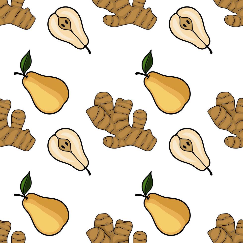 A vibrant pattern featuring whole and halved pears alongside textured ginger roots, creating a fresh and natural background for culinary or health related themes. Pro Vector
