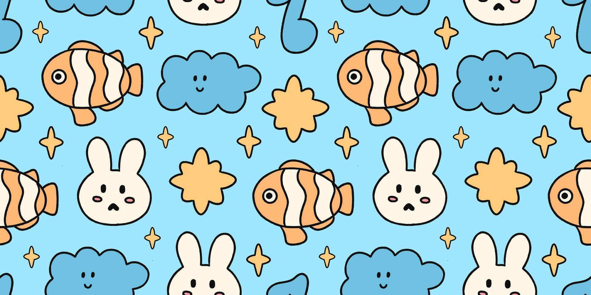 Kawaii pattern with bunnies, clownfish, fluffy clouds and sparkling stars on a soft blue background. Charming friendly characters create a warm playful mood, perfect for kids themes and joyful designs Pro Vector