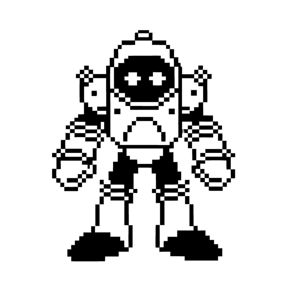Retro pixel robot character with armored suit and mechanical arms standing in heroic pose, minimalist black and white 8 bit Pro Vector