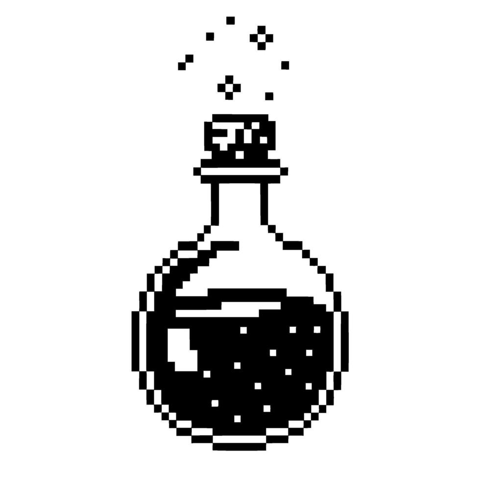 retro pixel art magic potion bottle with sparkling bubbles, monochrome fantasy elixir icon on transparent background Pro Vector