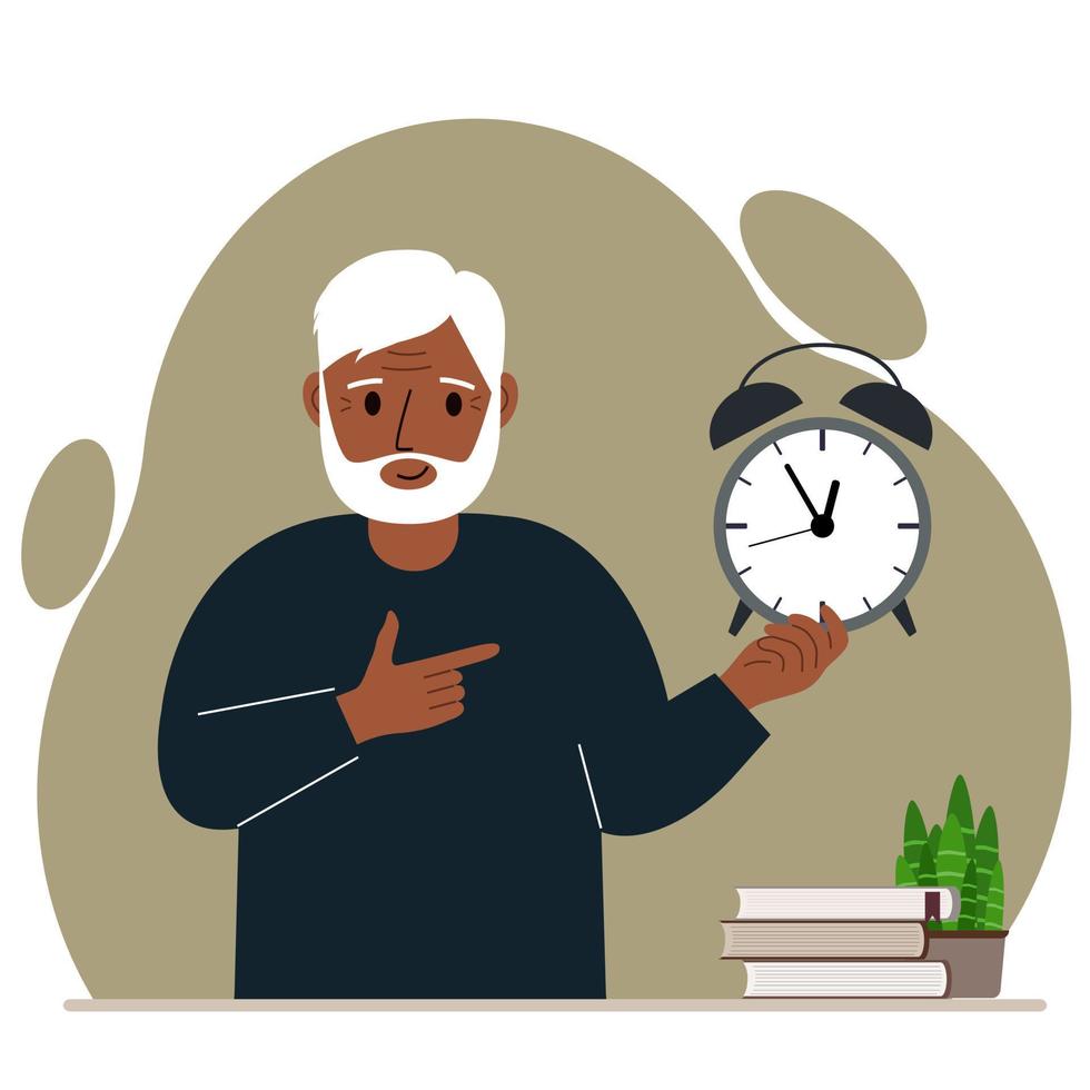 Modern concept of time management illustration. A smiling grandfather holds an alarm clock in his hand and the second points to it. Vector flat illustration Pro Vector