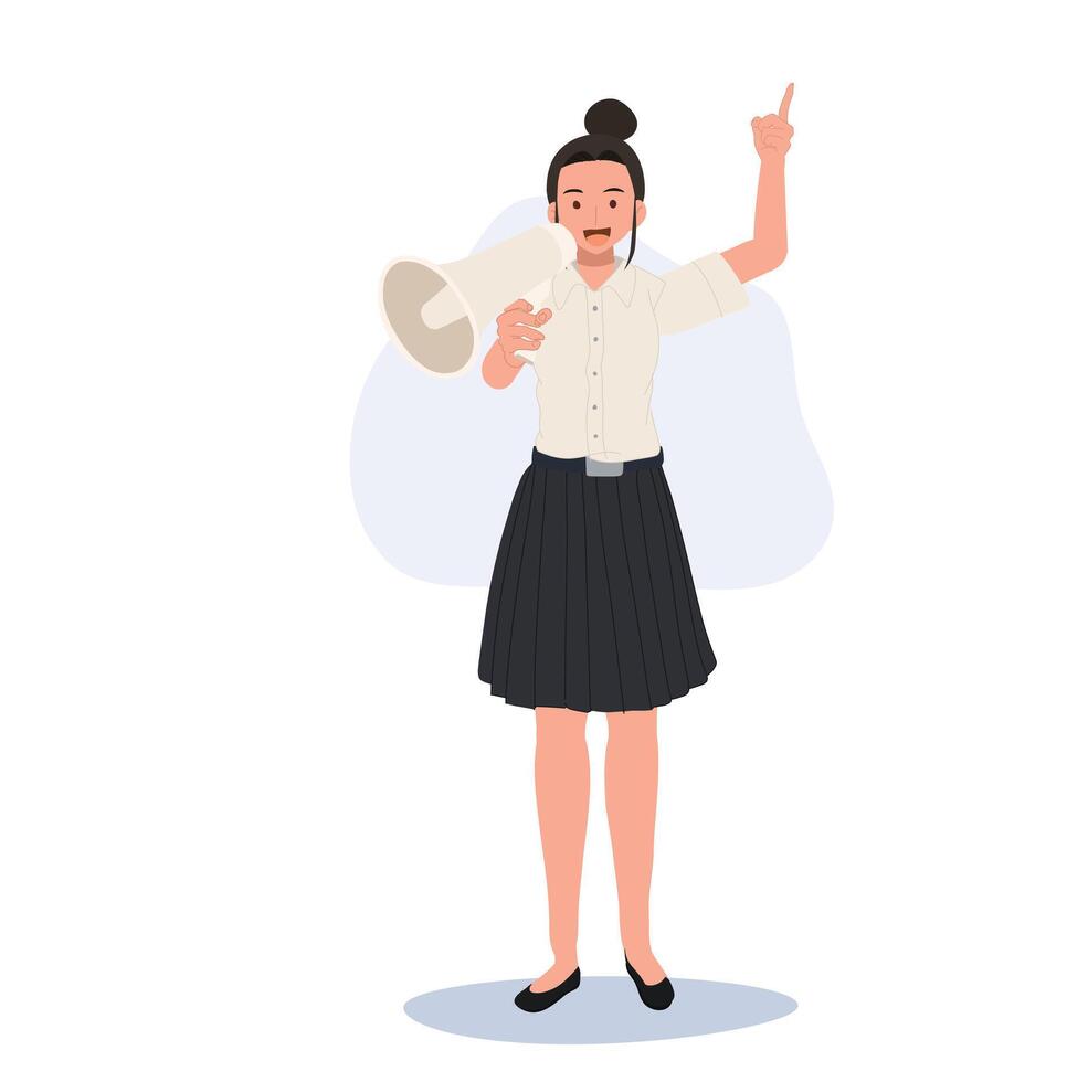 Thai University Student in Uniform with Megaphone. University Student in Uniform Shouting with Megaphone. . Pro Vector