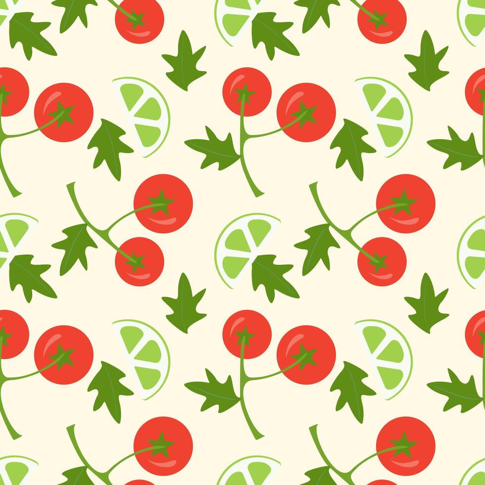 Vegetarian pattern with red tomatoes on branch and lime slices on soft beige background. Pro Vector