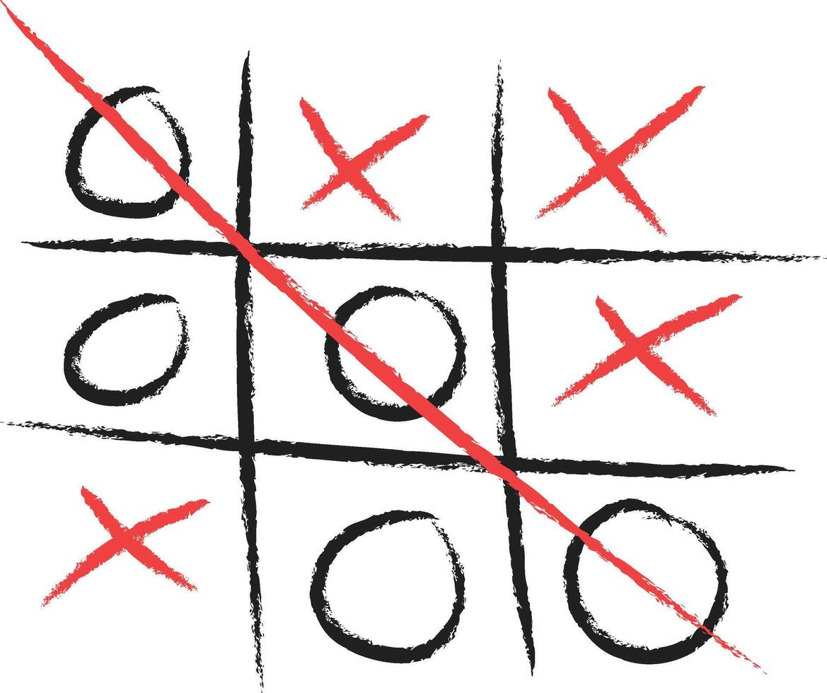 Hand drawn tic tac toe game board showing a diagonal win for the x player marked by a line vector