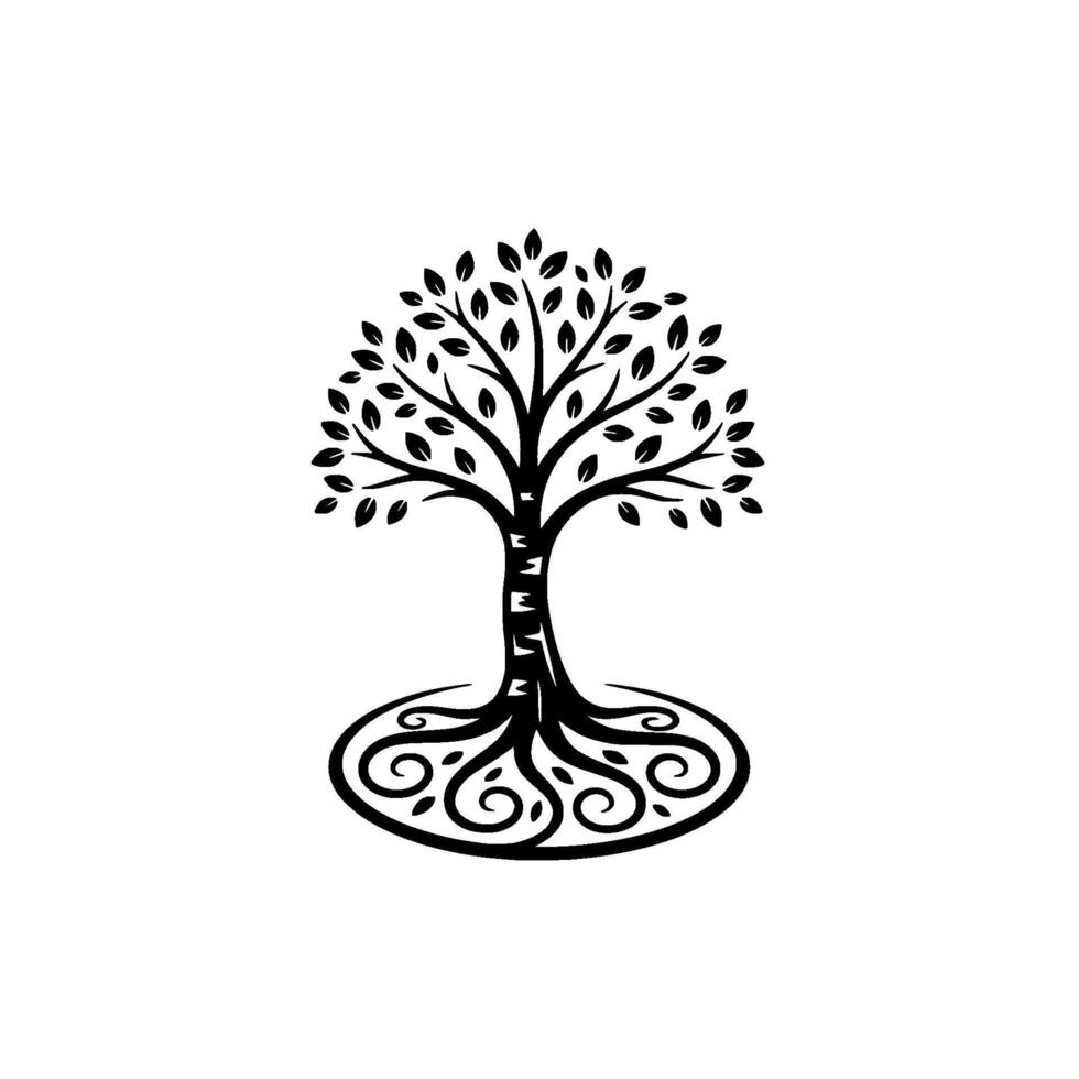 Stylized tree emblem depicting a mature tree with intricate branch detailing and a swirling root system rendered in a classic ornamental for nature and growth themes Pro Vector