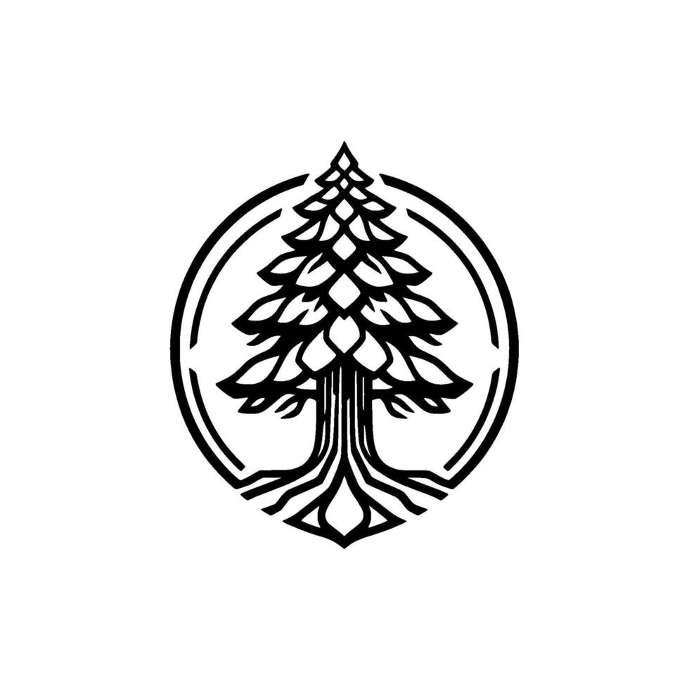 Detailed pine tree emblem illustration showcasing intricate branch patterns within a circular stylized badge for nature and wilderness branding Pro Vector