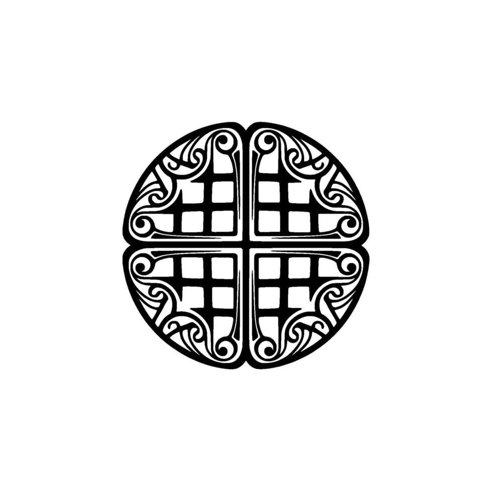 Intricate circular emblem depicting a stylized shield with interwoven geometric patterns and a central grid representing ancient heraldic and historical symbolism Pro Vector