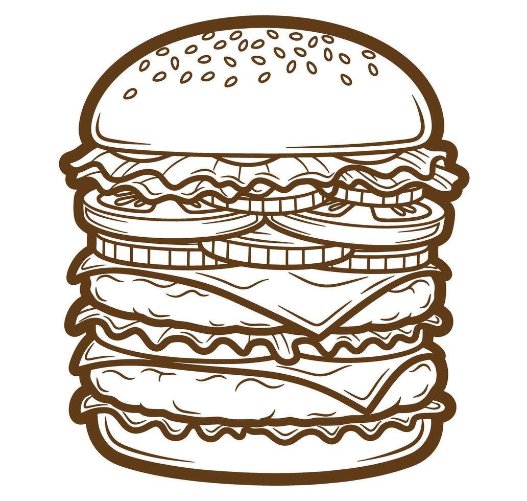 Large hamburger with multiple layers of meat and toppings on a bun Pro Vector