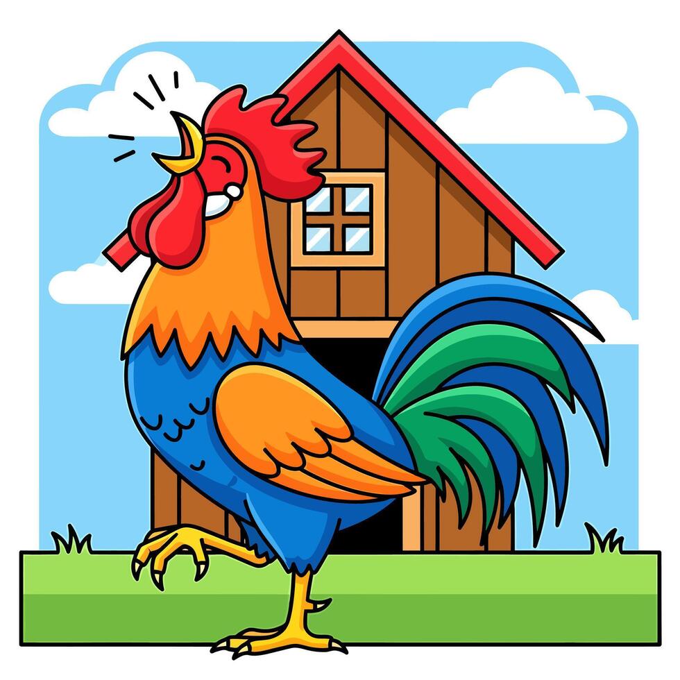 A Roaming Rooster Crowing Loudly with its Tail Feathers Displayed in Front of a Barn on a Sunny Day with Clouds, Capturing the Spirit of a Farm Pro Vector