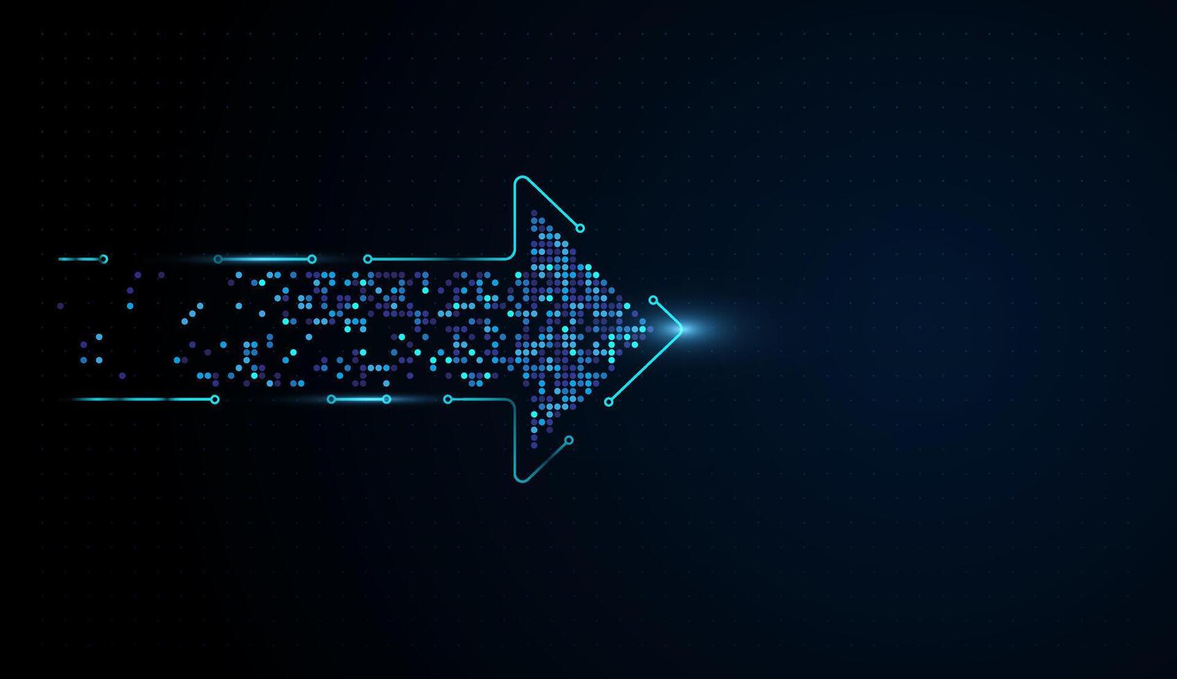 A luminous arrow shape emerges from scattered pixels, illustrating innovation consolidating into clear direction. Abstract arrow direction technology background Pro Vector