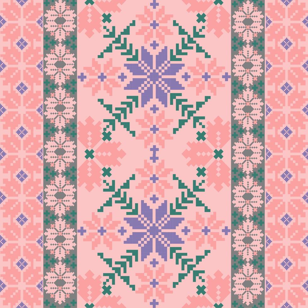 A Pink fabric-inspired Floral pixel art pattern with a handcrafted look. Repeating geometric motifs in pixel style, perfect for ethnic textile prints, digital fabric design Pro Vector