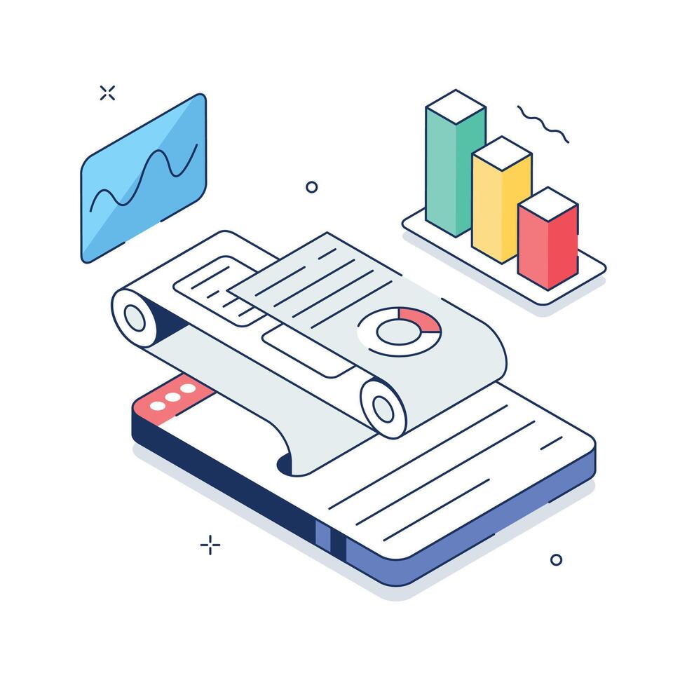 An isometric illustration of business report with charts, graphs, and data insights Pro Vector