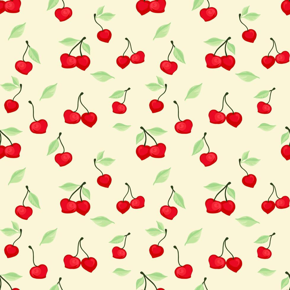 Playful seamless pattern with shiny red cherries, delicate stems, and soft green leaves on a light cream background, creating a fresh, bright, and cheerful fruity design Pro Vector