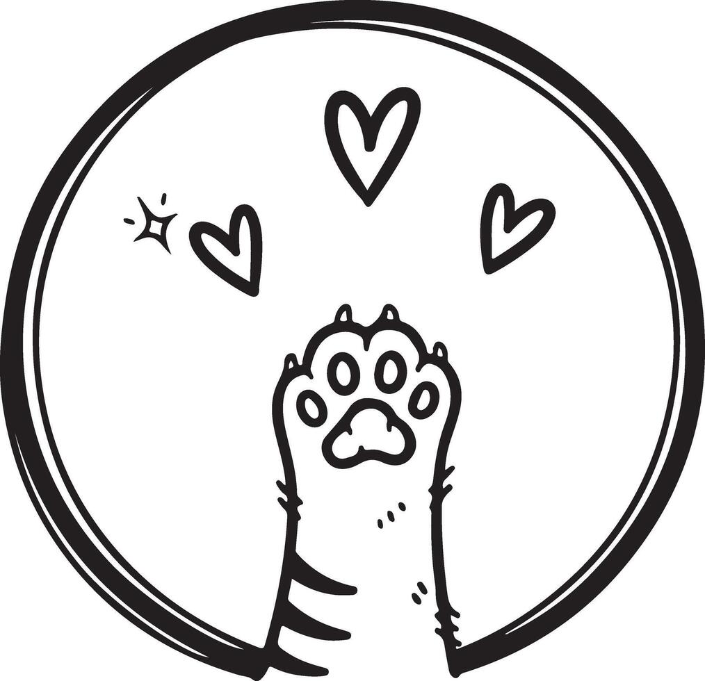 Cute cat paw reaching up with loving hearts and a sparkle in a simple circular frame vector